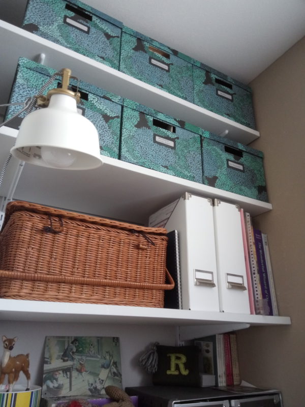 普段めったに出さない小物等の収納を棚の高いところに箱に分けて収めています。